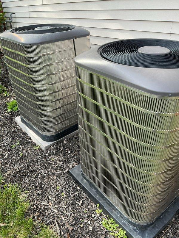 Responded to no cooling complaint on dual HVAC system. Upon arrival, inspected both outdoor condensing units—one cylindrical vertical-fin condenser and one standard rectangular unit positioned on exterior concrete pad. Performed diagnostic evaluation to identify which of the two units was experiencing cooling failure and assessed overall system operation. Documented equipment condition and installation configuration with photos for customer communication regarding diagnosis and recommended repairs.