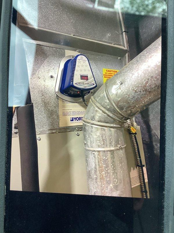Completed warranty replacement of defective REME HALO air purification unit in YORK HVAC system. Removed failed unit, installed new REME HALO device, verified proper operation and display functionality, and retained original unit per warranty protocol.