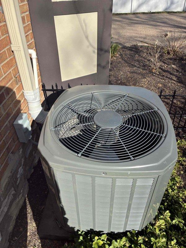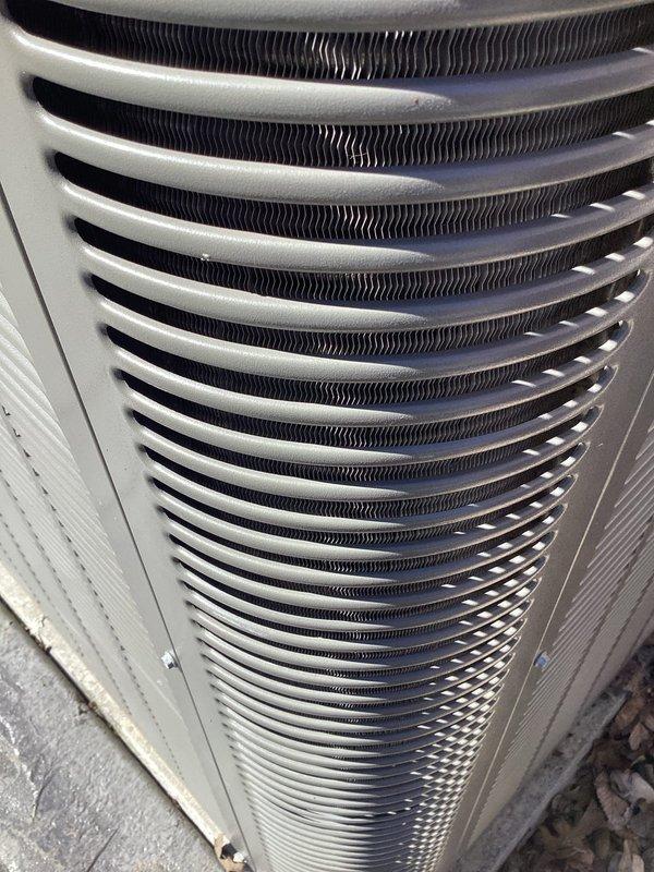 Responded to no-cooling complaint on 9-year-old AC system. Inspected outdoor condenser unit and found cooling fins in good condition with no visible damage or debris accumulation. System was restored to proper cooling operation after service.