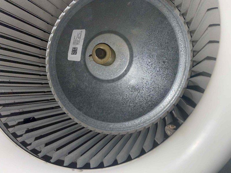 Responded to service call for noise complaint in HVAC system. Upon inspection, found dust accumulation on blower wheel assembly. Cleaned squirrel-cage fan blades and hub assembly, verified proper operation with no abnormal noise during test cycle.