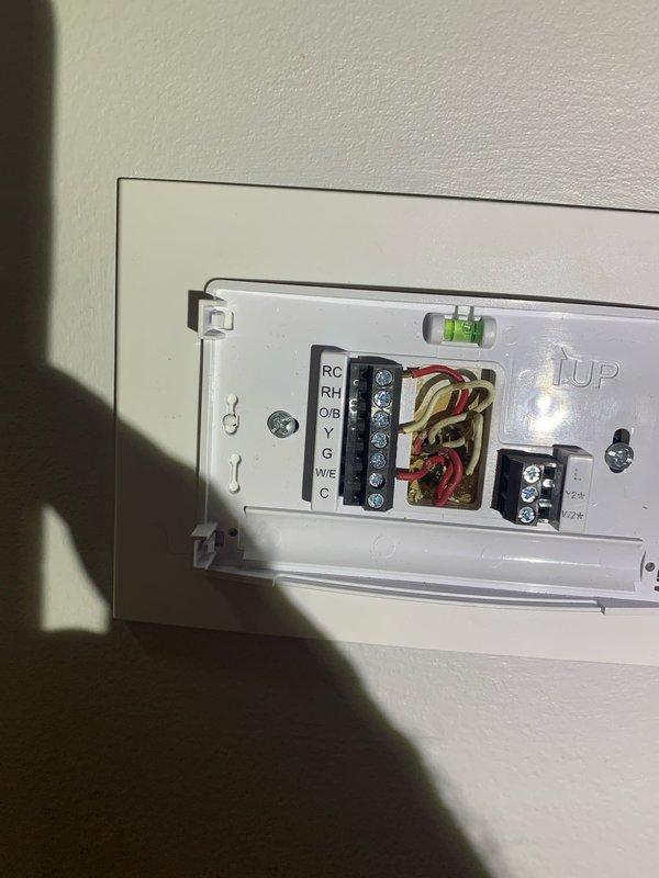 Responded to no cooling call on Lennox air conditioning system installed last year. Upon arrival, found unit not responding to thermostat commands. Inspected thermostat wiring and terminal connections, verifying proper wire placement at RC, RH, O/B, Y, G, W/E, and C terminals. Checked thermostat level and mounting integrity. Documented internal wiring configuration for service records.