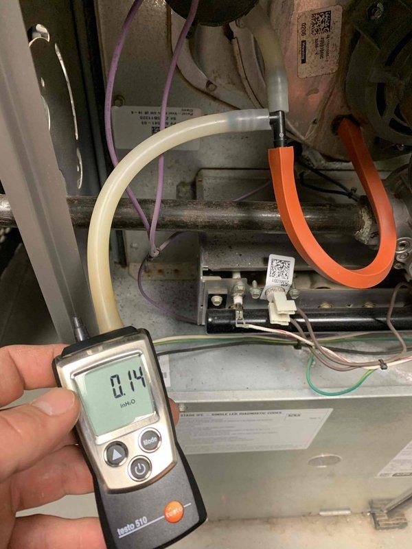 Responded to callback for furnace with non-functioning blower. Diagnostic testing with Testo 510 manometer revealed pressure reading of 0.14" WC, indicating restricted airflow. Inspected and cleaned system components to restore proper air circulation, confirming normal operation before completion.