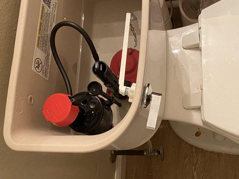 Responded to a service call for multiple toilets that continue to run when not in use with reported issues of float adjustment difficulties and worn toilet handles. Upon inspection of the main bathroom toilet, the tank assembly was examined and found to contain a functional flush mechanism with intact components. Documented the current condition with photographs for service records.
