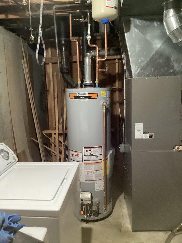 Completed installation of 50-gallon tall gas water heater in basement mechanical room. Connected copper supply piping with shutoff valves, installed proper venting system with metallic duct connections, and integrated expansion tank into the system. Applied required plumbing identification sticker per permit #26PLU-07323 and verified all connections for proper operation and code compliance.