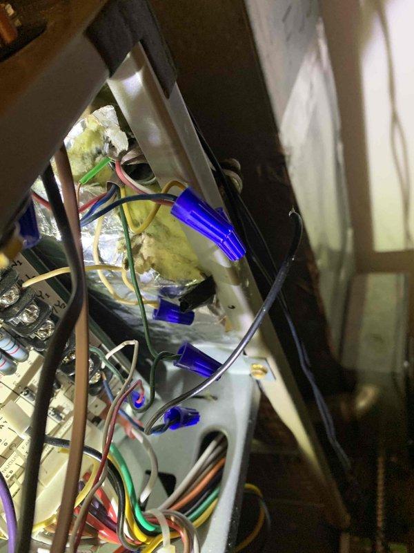 Responded to service call for continuous fan operation on HVAC system located in utility closet. Upon arrival, accessed unit interior and performed diagnostic inspection of blower motor, control board, and thermostat wiring connections. Verified all electrical connections, examined fan relay operation, and tested system controls to identify cause of fan not cycling off properly. Inspected refrigerant lines, wiring harness integrity, and control sequences for both heating and cooling modes. Documented equipment condition with interior cabinet photography showing copper refrigerant lines, multi-colored control wiring, and insulation placement. Unit is under 10 years old with accessible service panel. Completed troubleshooting procedures and provided findings to address continuous fan operation issue.
