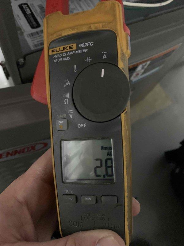 Responded to customer concern regarding increased electrical bills potentially related to furnace operation. Performed diagnostic testing using Fluke 902FC clamp meter, which recorded 2.8 Amps AC current draw on the 3-year-old basement furnace. Measurements confirmed unit is operating within normal electrical parameters, ruling out the furnace as source of increased electrical consumption.